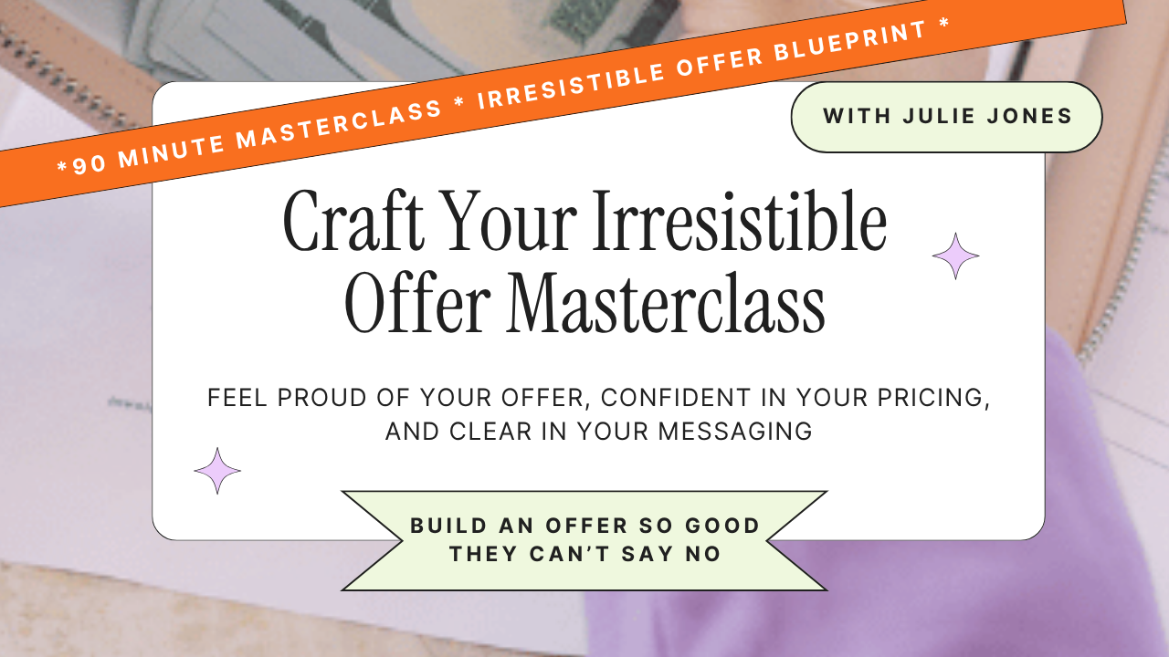 - Register now and you’ll receive a personal audit, feedback, and tips for improving your offer via voice message in Telegram from Julie Jones. Redeem this bonus within 30 days of the masterclass and get customized guidance on making your offer even stronger.